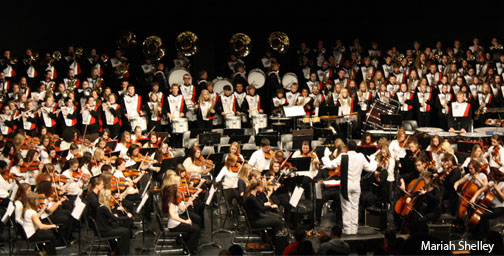 Immediately following the conferences was the opening event in the new theater. The orchestra and marching band wowed a standing-room only audience even before playing a note, because they all fit on the stage at once! When they played their sets, including a few combined numbers (Did you know the orchestra plays the school song too?), the audience was truly impressed. It was a fitting way to christen the new stage. Thanks to Mariah Shelley for the impressive photo.