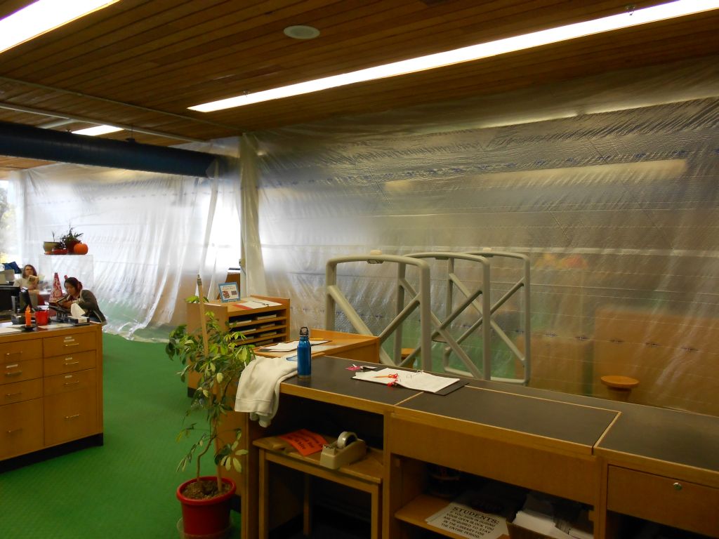 A week after drips from the ceiling led librarians and custodians to redecorate the library with buckets, basins, and plastic, half the library continues to be off limits–the fiction and reference sections. The fall out from the blizzard may be drawing to a close, however, as custodians have been drying the carpet with blowers and emptying the buckets and trash cans of the collected water. Beginning Friday afternoon carpet cleaners are coming to make sure nothing lasting is growing in the carpet, which should mean that on Monday students can resume browsing through and checking out fiction.