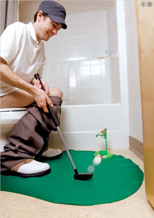 Do you ever spend countless hours on the porcelain throne looking for activities to pass the time? What do you do after your social networking feeds run dry and you are out of options for potty entertainment? Introducing Pot-N-Put Bathroom Golf “Sink one while you stink one.” Pot-N-Put comes with the putting green, 2 golf balls, a putter, a flagstick, and of course, a “do not disturb sign.” The Pot-N-Putt will help improve your golf game and help pass those sometimes long bathroom times. You can buy your own Pot-n-Putt for the Price of only 18.95. A great gift for the golfers in your life! – Garret Hougland