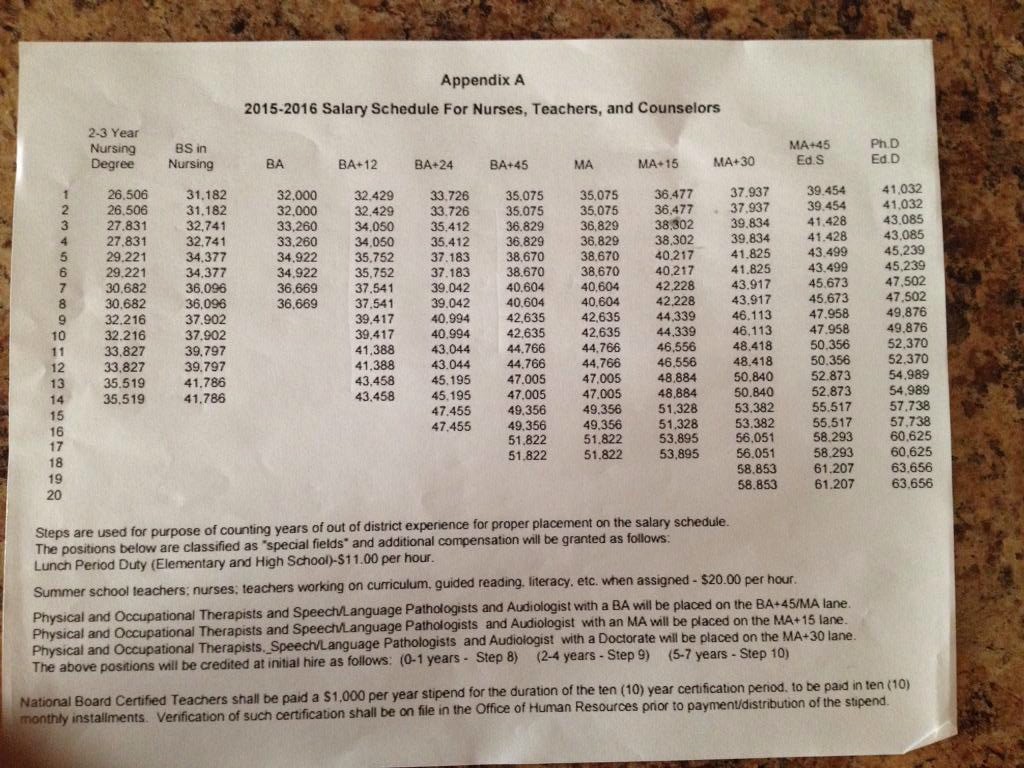 Teacher salaries are based on a pay scale that includes variables such as education, degrees, and experience. The more progress made towards the bottom right corner of the chart, the higher amount of money in the individual’s pocket.
