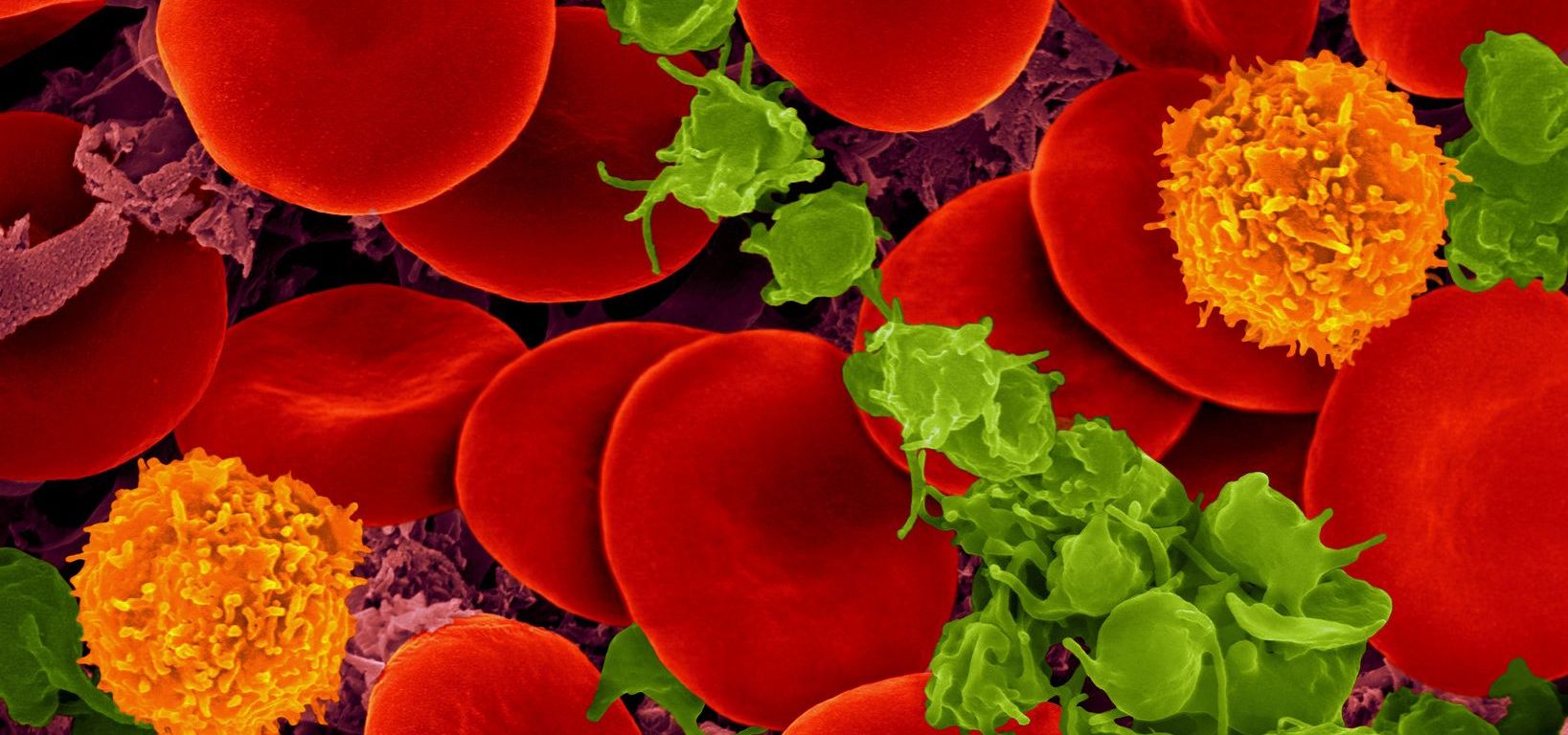 Photo: Human blood with red blood cells, T cells (orange) and platelets (green) by